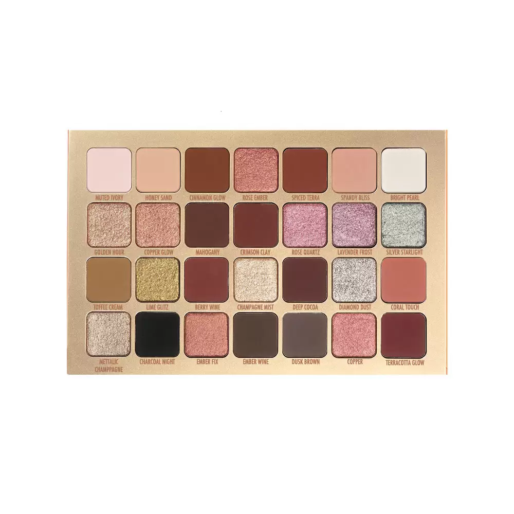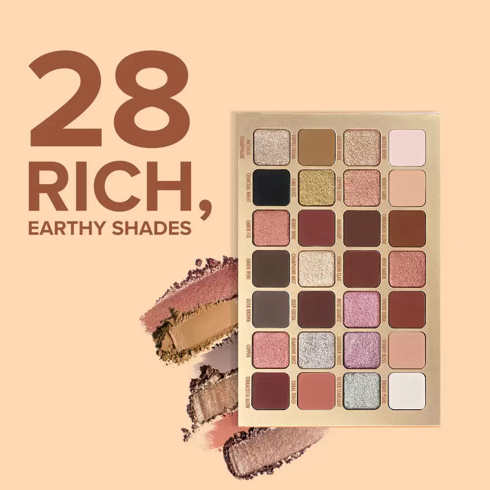 • ۲۸ رنگ کاربردی و چشمگیر: این پالت شامل رنگ‌هایی از طیف‌های گرم، خنثی و سرد است که به شما امکان می‌دهد انواع آرایش‌های کلاسیک، گلام، فانتزی یا روزانه را خلق کنید.